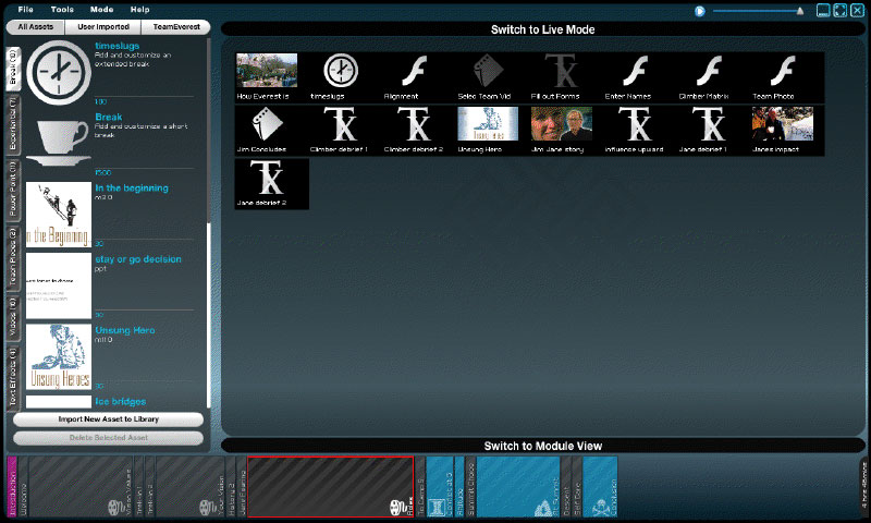 - Asset library for drag-and-drop convenience in adding media elements, and experiential activities to your timeline