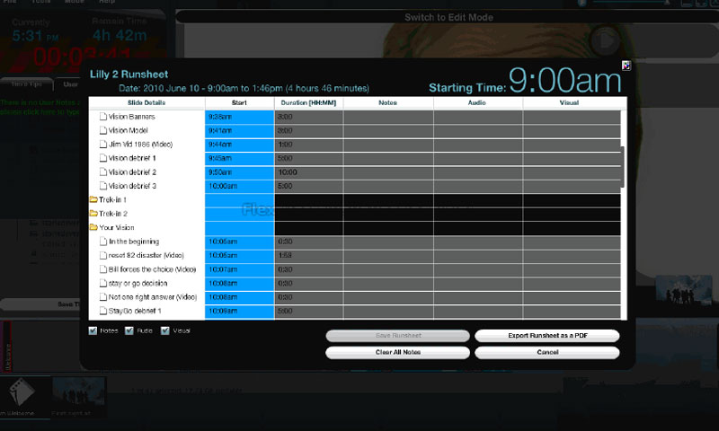 - Synchronized Run Sheet literally can save hours of recalculating timing based on changes to the agenda. The Run Sheet feature updates automatically with all changes to timing and timeline, includes space for logistical notes, AV notes and cues, exportable as pdf for easy distribution to event staff.